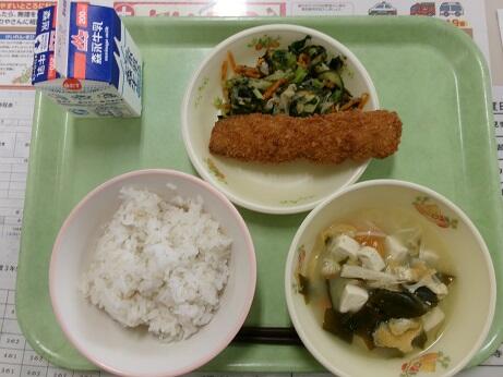 今日の給食:麦ごはん、豆腐のみそ汁、太刀魚のフライ、野菜の磯あえ、牛乳