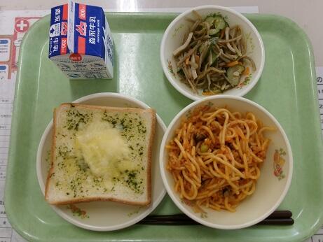 今日の給食:ガーリックチーズトースト、なすのミートスパゲティ、ごぼうのサラダ、牛乳
