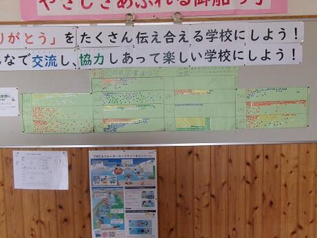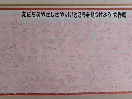 次に1年生教室横に掲示してある、「友だちのやさしさやいいところを見つけよう大作戦」の中から、いくつかを紹介してくれました。