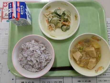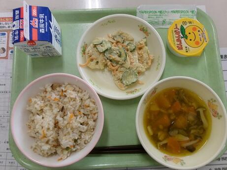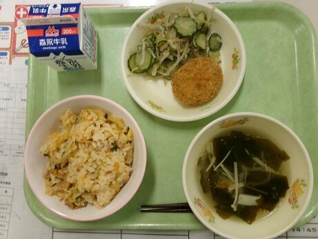 今日の給食:キムチごはん、わかめスープ、枝豆と豆腐のミンチカツ、きゅうりのごまあえ、牛乳