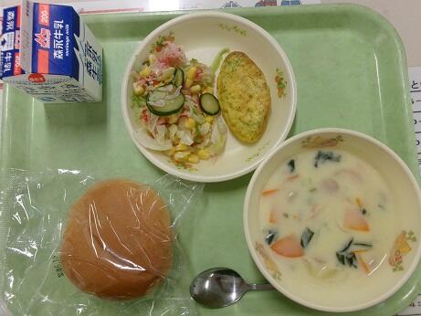 今日の給食:丸パン、ウインナーのミルクスープ、ほうれんそう入りオムレツ、海鮮サラダ、牛乳