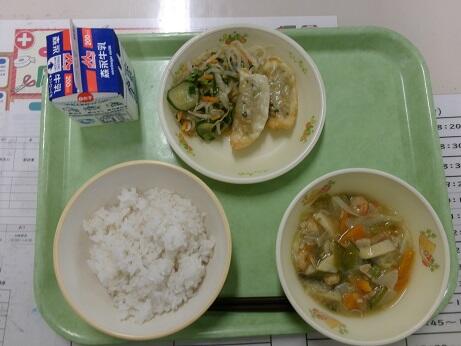 今日の給食:麦ごはん、八宝菜、ぎょうざ、ナムル、牛乳