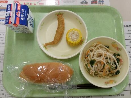 今日の給食:ミルクパン、冷やし中華、子持ちししゃもフライ、とうもろこし、牛乳