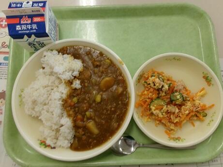 今日の給食:キーマカレー、にんじんサラダ、牛乳