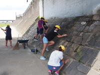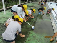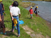 7月31日(金)の5・6時間目、ネクストリーダープロジェクトの一環で、6年生全員で御船川の清掃活動をしました。この日の気温は30度を超えてとても暑かったです。水分補給をしたり帽子をかぶったりと、熱中症対策をして、汗を流しながら一生懸命掃除をしました。