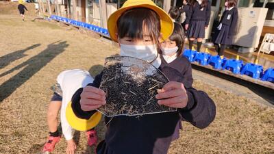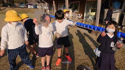 1年の生活科、各季節の特徴がある植物や生き物など探して観察したり調べたりする学習があります。現在、冬の季節です。昨夜から冷え込み、今朝は氷点下の気温でした。このことを見越して、昨日から、皿やペットボトルに水を入れて、芝生広場に置いて帰りました。今朝、ペットボトルには薄い氷ができ、皿には少し厚みのある氷ができました。できた氷を持っている様子です。私が小さい頃は、軒先や学校の水道蛇口につららができました。近年、つららを見ることはありません。つらら・・・お分かりでしょうか。