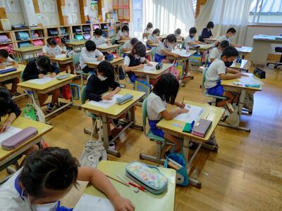 夏休み明けに出品した「読書感想画」「読書感想文」「こころピア書道展」の入賞者を全校表彰しました。読書感想画で特選の5年生このみ祐心さん、読書感想文で入選の6年生柿原心音さん、こころピア書道展で天賞の3年生飯川夏望さんを代表で表彰しました。読書感想画と読書感想文入選者は、次回の学校便りでお知らせする予定です。(こころピア書道展はお知らせ済みです)入賞者のみなさん、おめでとうございます。