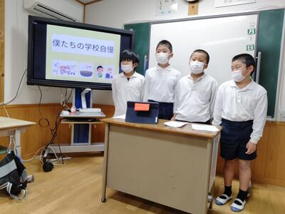 3年生は、国語の時間に「私たちの学校自慢」を取材して、班ごとにタブレットを使って発表しました。どんな自慢をまとめたかというと、「にぎやか自慢」「タブレット自慢」「元気なこと自慢」「外でたくさん遊ぶ自慢」「運動ができる自慢」「会社の活動自慢」「学校給食自慢」です。発表の様子は、このホームページの「限定公開 動画」で見ることができます。