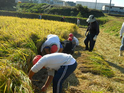 5,6時間目に、6月に田植えをしたもち米の稲刈りをしました。4年生保護者の橋本さんと6年生保護者(祖父)の上原さん、松尾先生が指導されました。稲刈りカマを使って、一束一束をザクザクと刈りました。初めての体験でしたが、上手に刈っていました。刈った稲は、コンバインで脱穀まで行いました。その後、乾燥をお願いしました。
