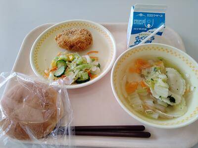 本日の献立は、「米粉パン」「手作りコロッケ」「ラビリオスープ」「コールスローサラダ」「牛乳」です。