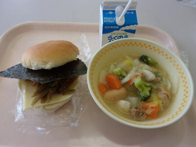 本日の献立は、「きんぴらバーガー」(まるぱん、きんぴら、のり、チーズ)、「かぶのポトフ」、「牛乳」です。