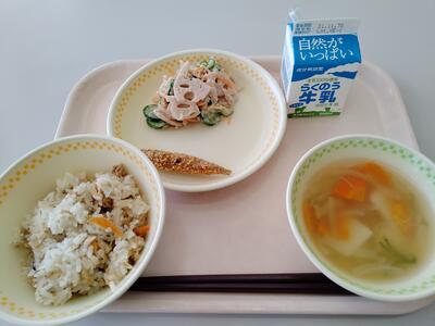 本日の献立は、「びりんめし」「白玉すまし汁」「れんこんサラダ」「いわしのカリカリふらい」「牛乳」です。