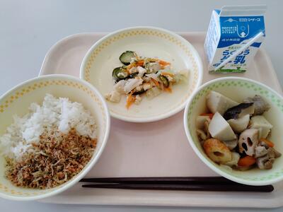 日曜日から今日(火曜)まで、三加和中2年生は鹿児島方面の修学旅行です。そこで、今日は鹿児島の特産品である「きびなごとらっきょう」が使用されたメニューとなりました。サラダを食べたとたん、「らっきょう」の味・香りがしてすぐに気づきました。きびなごは,甘酢に付けてあるのか、美味しくいただきました。