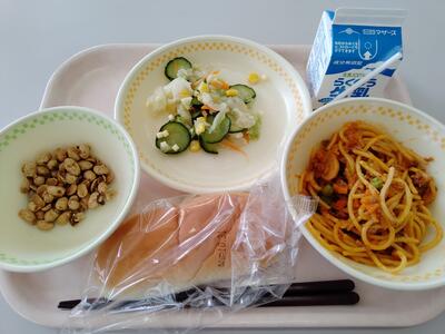 本日の献立は、「ミルクパン」「ミートスパゲティー」「チーズサラダ」「黒糖ビーンズ」「牛乳」です。