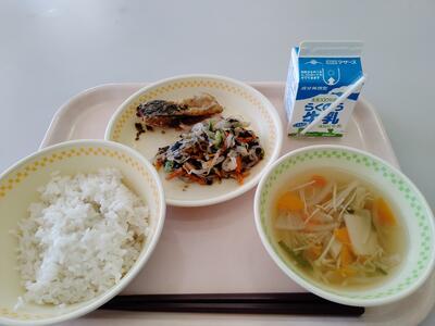 本日の献立は、「麦ごはん」「さばの香味揚げ」「磯和え」「きの汁汁」「牛乳」です。