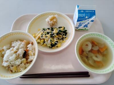 今日の献立は、とり飯、すまし汁、和え物、卵焼き、牛乳です。