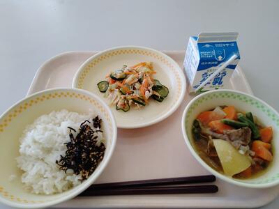 本日の献立は、「麦ごはん」「肉じゃが」「ささみサラダ」「ひじききくらげのふりかけ」「牛乳」です。