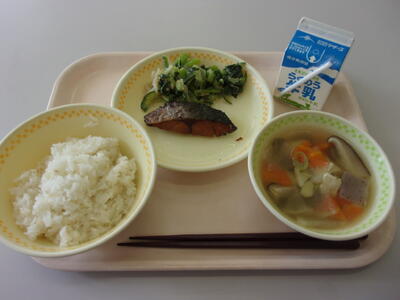 本日の献立は、「麦ごはん」「ぶりの照り焼き」「小松菜のごま和え」「けんちん汁」「牛乳」です。