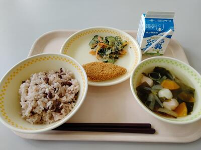 本日の献立は、「赤飯」「ホキフライ」「白菜のごま和え」「紅白はんぺん汁」「牛乳」です。