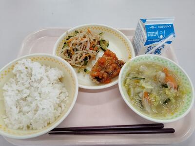 本日の献立は、「麦ごはん」「鰺のチリソース」「切り干し大根サラダ」「春雨スープ」「牛乳」です。