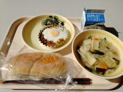本日の献立は、「ミルクパン」「カレーココット」「ほうれん草サラダ」「ワンタンスープ」「牛乳」です。