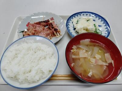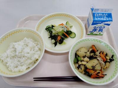 本日の献立は、「麦ごはん」「大豆の磯煮」「酢みそ和え」「牛乳」です。