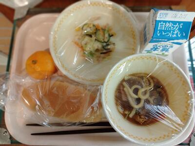 本日の献立は、「ミルクパン」「カレーうどん」「げんきサラダ」「みかん」「牛乳」です。写真は、配膳用の見本です。