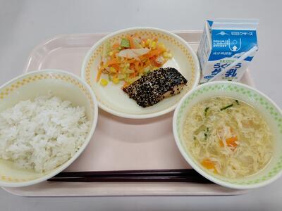 本日の献立は、「麦ごはん」「さばの南部焼き」「人参サラダ」「かき玉汁」「牛乳」です。