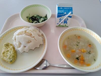 本日の献立は、「さつまいも蒸しパン」「大根のポタージュ」「ほうれん草サラダ」「オムレツ」「牛乳」です。