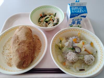 本日の献立は、「揚げパン」「肉団子と春雨のスープ」「バンバンジー」「牛乳」です。