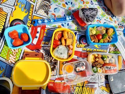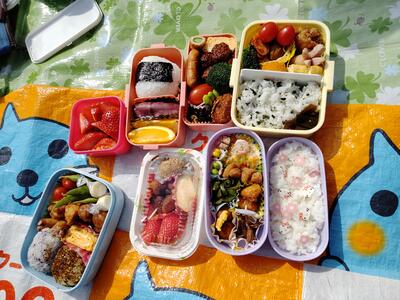 今日は、愛情たっぷり、手間、工夫たっぷりのお弁当作りありがとうございました。晴天の中、1年生と2年生は芝生広場に移動して、複数名で食べていました。1年生の3人のお弁当と2年生4人のお弁当を写真におさめました。断りもなく、すみません!!子供たちにとってのお弁当のメリットは2つ。1つが、好きなものが入っているので食べ残しがない。もう1つが、準備・後片付けがないため昼休みが長いことです。大好きなお弁当を食べて、約1時間遊びました。