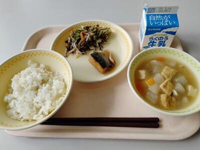 本日の献立は、「麦ごはん」「のっぺい汁」「鯖ゆずみそ」「磯和え」「牛乳」です。