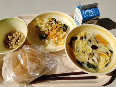 本日の献立は、「「パインパン」「クリームスパゲティ」「花野菜のサラダ」「黒糖ビーンズ」「牛乳」です。