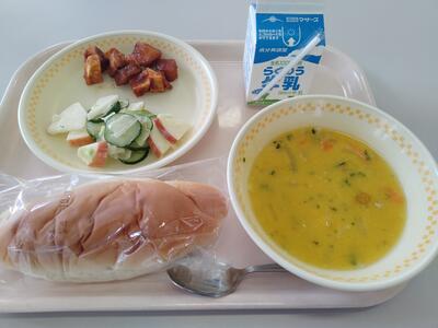 本日の献立は、「ミルクパン」「かぼちゃのポタージュ」「インディアンフィッシュ」「りんごサラダ」「牛乳」です。