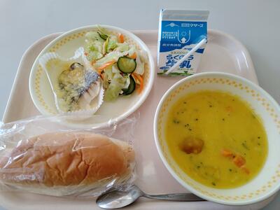 本日の献立は、「ミルクパン」「ホキのチーズ焼き」「ゆずサラダ」「かぼちゃのポタージュ」「牛乳」です。
