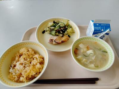 配付の献立には、「麦ごはん」となっていますが「キムチご飯」に変わりました。塩麹は、お米に麹菌をつけた「麹」と「塩」を合わせた調味料のことです。塩麹は、お肉をやわらかくする働きを持っていて、今日は「鶏肉の塩麹焼き」として提供されました。食後も、塩麹が口の中に残っています。海藻とボイルキャベツが和えてありました。衛生上、生野菜は提供されませんが、ずーっと前は、せん切りキャベツなど生野菜がでていました。