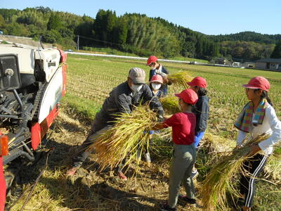 5,6時間目に、6月に田植えをしたもち米の稲刈りをしました。4年生保護者の橋本さんと6年生保護者(祖父)の上原さん、松尾先生が指導されました。稲刈りカマを使って、一束一束をザクザクと刈りました。初めての体験でしたが、上手に刈っていました。刈った稲は、コンバインで脱穀まで行いました。その後、乾燥をお願いしました。