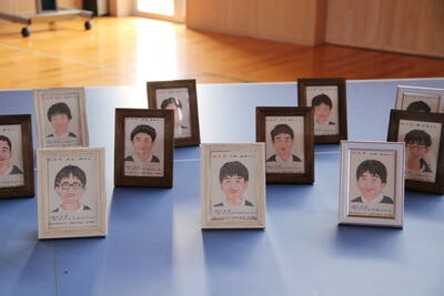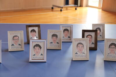 卒業式には、自分で考えた習字1文字(ごうざん先生指導)と、私(校長)から似顔絵を贈っています。今年は、「努力は必ず報われる」言葉を伝えました。