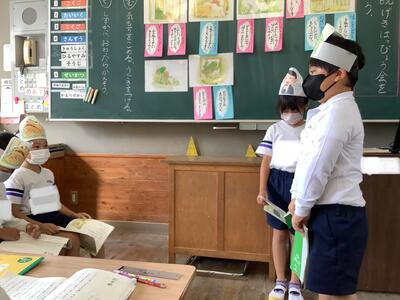 お面をかぶり、役になりきって、動きをつけて上手に発表することができました!