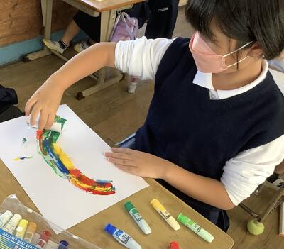 図工では、画用紙に絵の具をのせて厚紙をつかってのばしました。