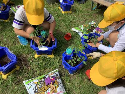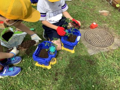 「もう花が咲きそうです!」と自分で植えて、育てているピーマンの成長に驚く子どもたちでした!