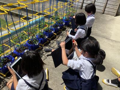 生活科の「ぐんぐんそだて、おいしいやさい」の学習の中で、自分の鉢でピーマンを、学級園でトマト、なす、おくらを育てています!