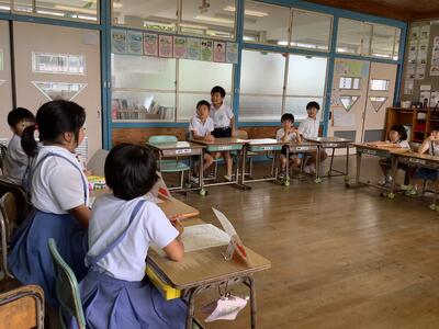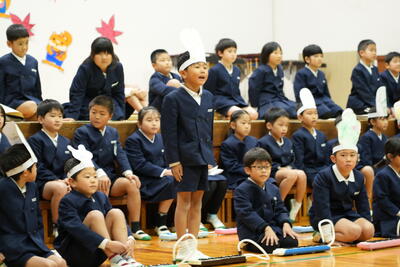 国語科で学習したアーノルド=ローベルの作品「お手紙」、「クッキー」、「ぼうし」を音読劇にして1年生に発表しました。かえるくんとがまくん、かたつむりくんの気持ちを想像しながら、抑揚や声量を変えて上手に読むことができました。