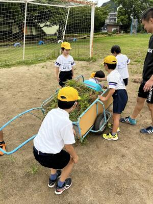 競技はもちろんの事、2年生としてなにかできることはないかと、朝から1組と合同で運動場の草取りと小石拾いを始めました。目に見えて変わっていく運動場の様子に、子供たちのボランティア精神は触発され、やりがいを感じながら楽しんで取り組んでいます。