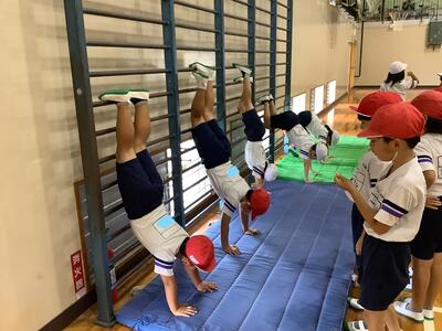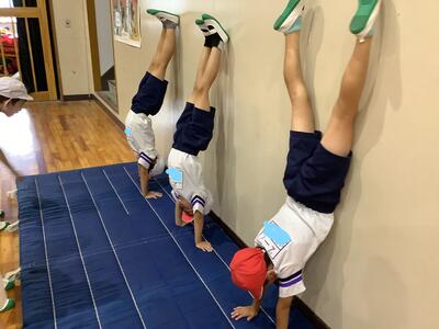 2年生になり、いろいろな技に挑戦しました。前転、後転はもちろん、開脚前転、開脚後転、伸膝後転、ろくぼくの倒立、壁倒立、倒立前転と一通りクリアする子供たちもいて、担任もビックリしました