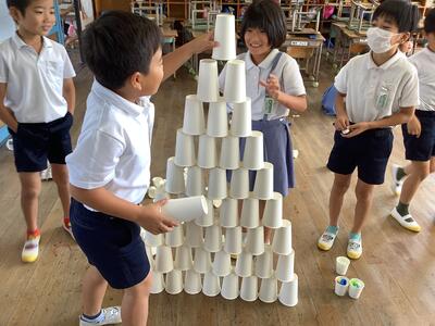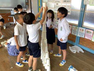 生活科の「あそんでためしてくふうして」の学習の中で、班ごとにみんなが楽しめるゲームを考えました。「ボーリング」や「積み上げゲーム」など、班ごとに工夫を凝らし、楽しいゲームを作っていました。
