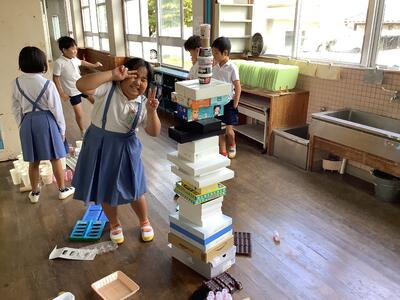 生活科では、「あそんでためしてくふうして」というおもちゃ作りの単元を学習中です。この時間は、みんなのお家から揃った空き箱やプラ容器、ペットボトルなどを使って、素材遊びを楽しみました。