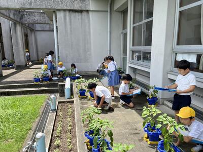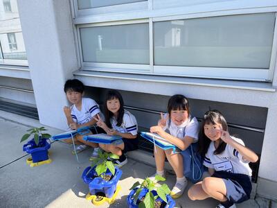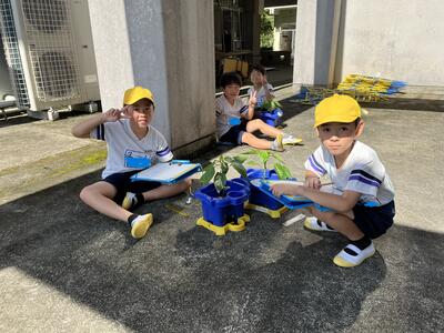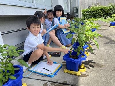 生活科の「ぐんぐんそだて、おいしいやさい」の学習の中で、自分の鉢でピーマンを、学級園でトマト、なす、おくらを育てています!