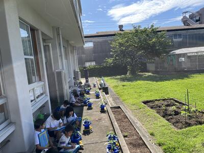 生活科の「ぐんぐんそだて、おいしいやさい」の学習の中で、自分の鉢でピーマンを、学級園でトマト、なす、おくらを育てています!