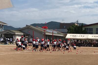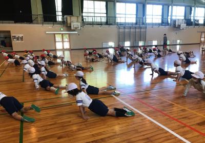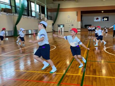 2年生では、体育の時間に1、2組合同で体ほぐしの運動あそびを行いました。